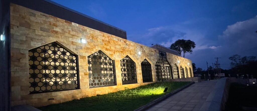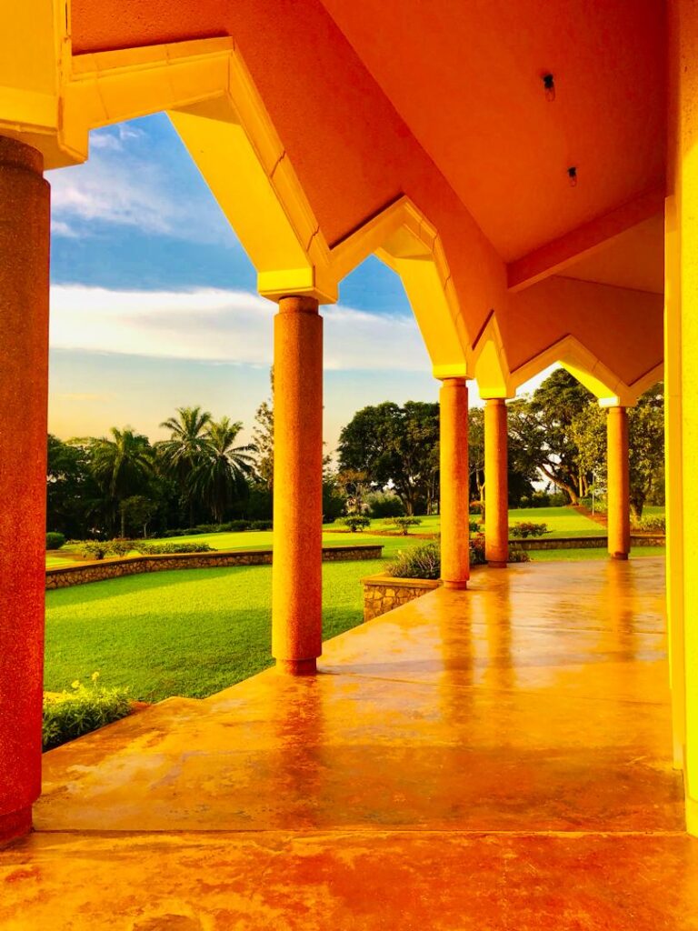 The Mother Temple of Africa is thoughtfully designed to harmonize with its natural surroundings, drawing inspiration from the form of a traditional African hut. Its wide eaves provide shelter from the region’s climate, while a nine-sided dome crowned by a lantern rises gracefully above. Green mosaic tiles adorn the exterior, and inside, soft hues of blue, white, green, and amber reflect and blend with the colours of the surrounding landscape.